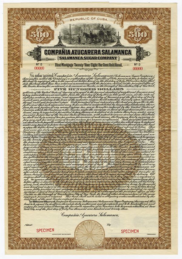 Cuba. $500 Specimen 8% First Mortgage Twenty Year Gold Coupon Bond, Black print with brown border and under tint, Sugar Cane Field/Workers at top, Specimen overprints and POC's, VF-XF condition, ABNC.