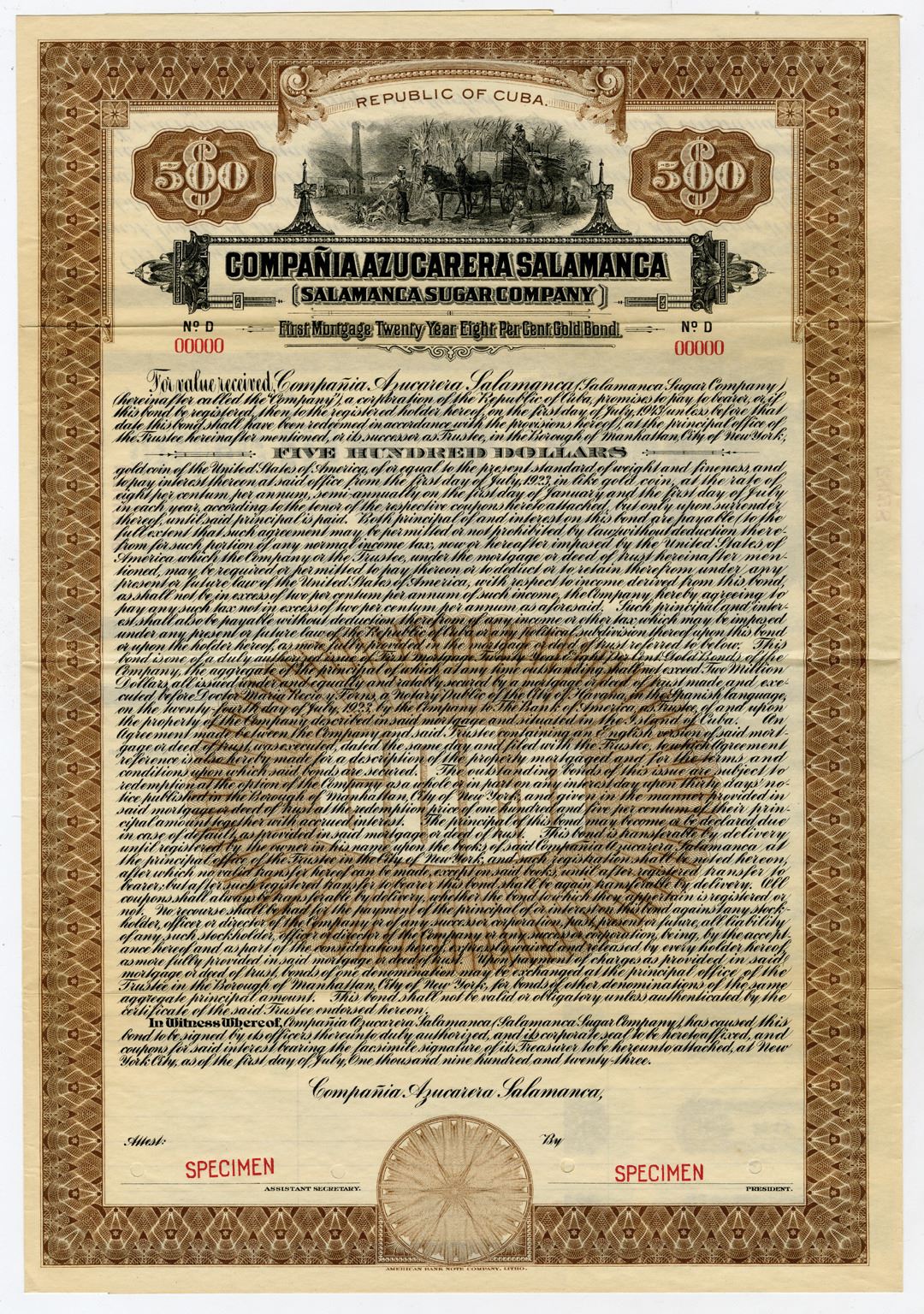 Cuba. $500 Specimen 8% First Mortgage Twenty Year Gold Coupon Bond, Black print with brown border and under tint, Sugar Cane Field Workers at top, Specimen overprints and POC's, VF-XF condition, ABNC.