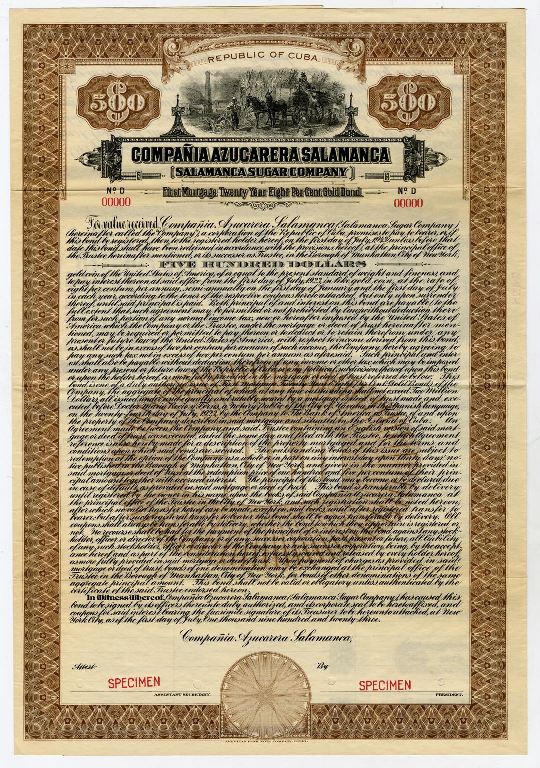 Cuba. $500 Specimen 8% First Mortgage Twenty Year Gold Coupon Bond, Black print with brown border and under tint, Sugar Cane Field Workers at top, Specimen overprints and POC's, VF-XF condition, ABNC.