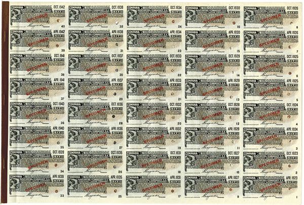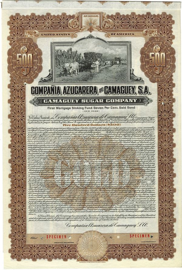 Cuba, 1922, Vertical $500 1st Mortgage Sinking Fund 7% Gold Bond Specimen Certificate, Brown border with Sugar Cane harvest vignette, Specimen overprints, POCs, Coupons attached, HBNC, XF condition.