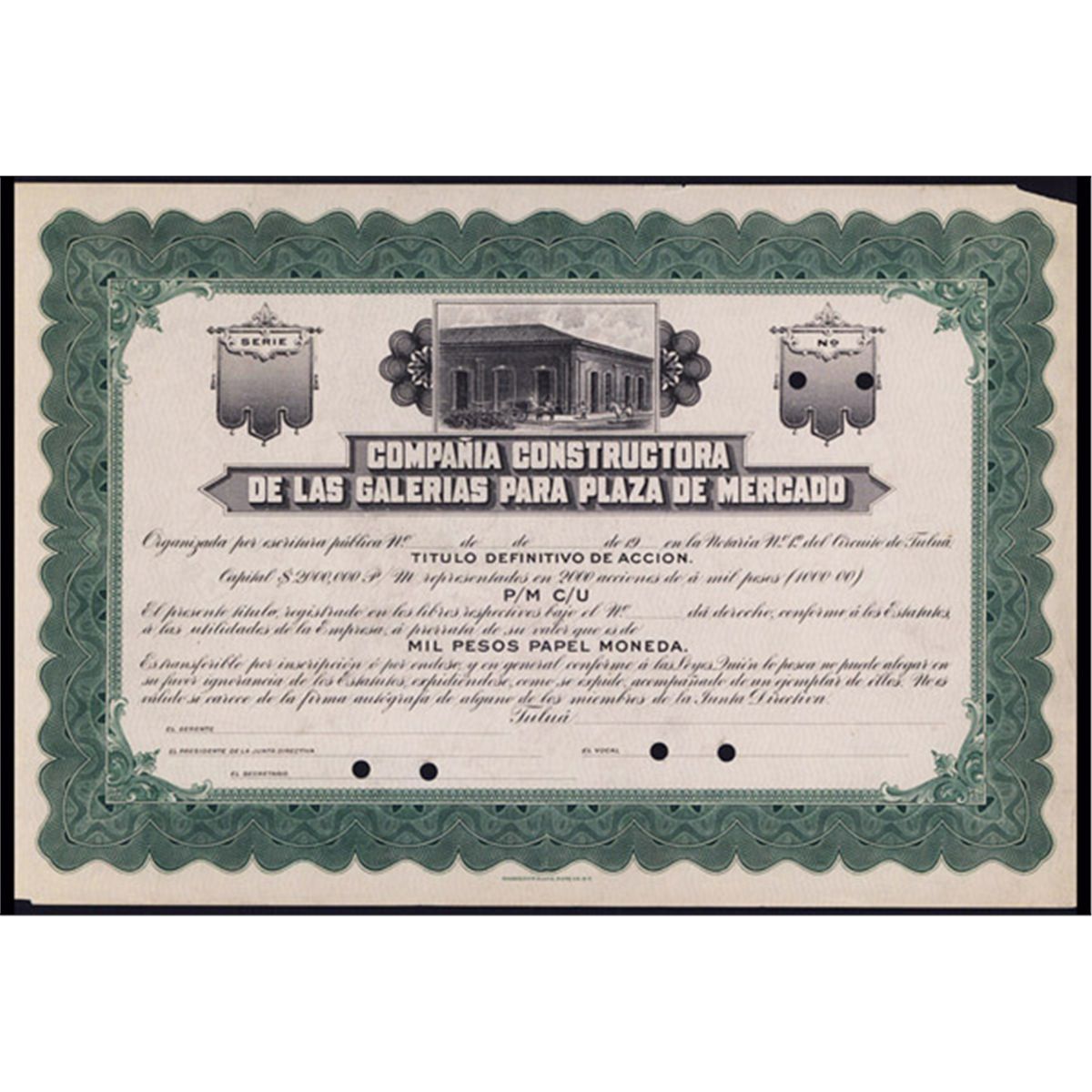 Tulua, Colombia, ND (ca.1920-30), Odd Shs, Specimen Stock certificate, Green border with Building, POC's, HBNC., Fine condition with the upper right corner tip missing.