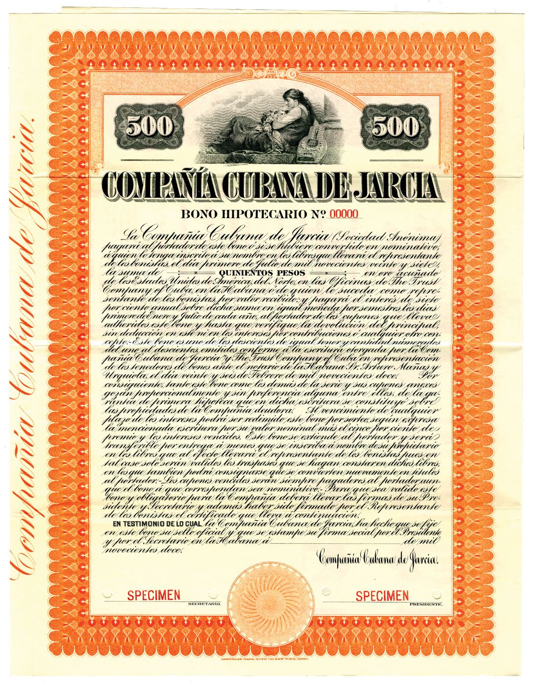 Cuba, 1913, $500, Specimen coupon bond, Black on orange border and underprint, Reclined allegorical woman top center with flowers and musical instrument, Coupons attached, VF-XF condition, ABNC.
