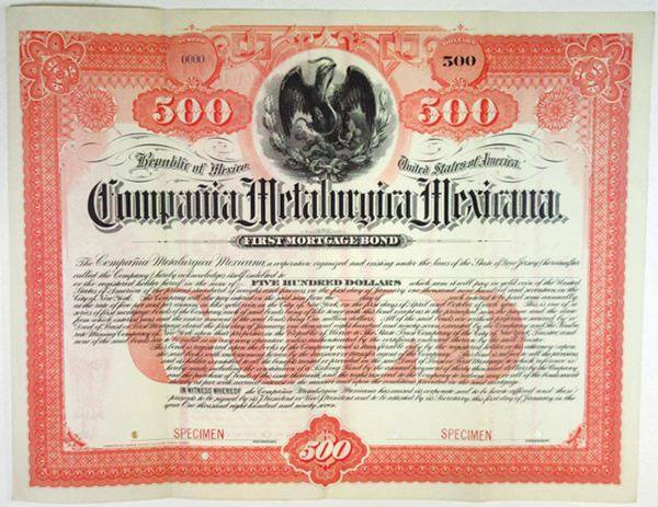 Mexico (Incorporated in New Jersey). $500 Registered 5% Specimen 1st Mortgage Bond, Black print on red border and under tint on horizontal format, Seal of Mexico at top, Specimen overprints and POC's, VF-XF condition, ABNC.