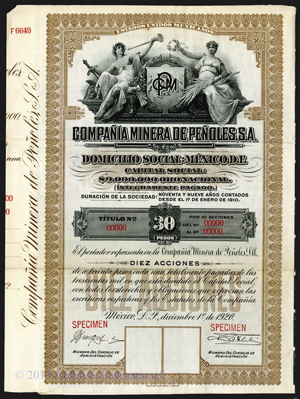 Mexico, D.F. Specimen stock-bond. 30 Pesos. Brown border and undertint. Allegorical women flank initials on shield Vignette. Red specimen overprint. XF condition. ABNC. Scarce bond.