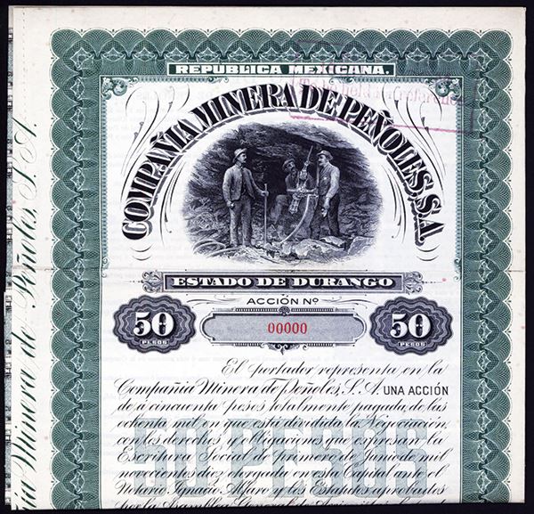 Mexico, 1910, 50 Pesos, Specimen Bond, Black on green border and underprint, Three men in a mining scene top center, Coupons attached, VF-XF condition, ABNC.