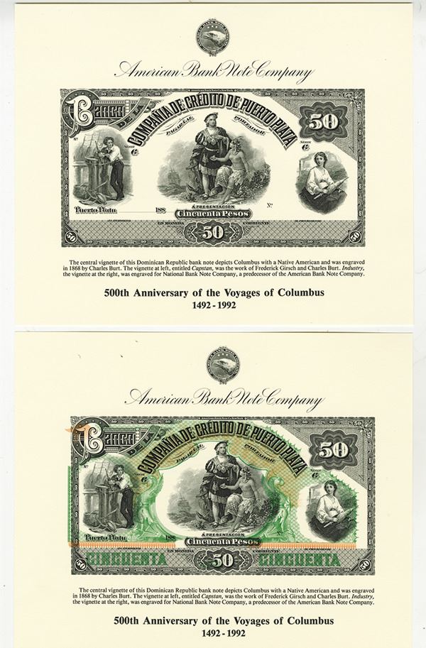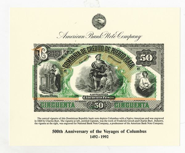 Compania de Credito de Puerto Plata proof note used on the 1992 Voyages of Columbus Souvenir Card Pr
