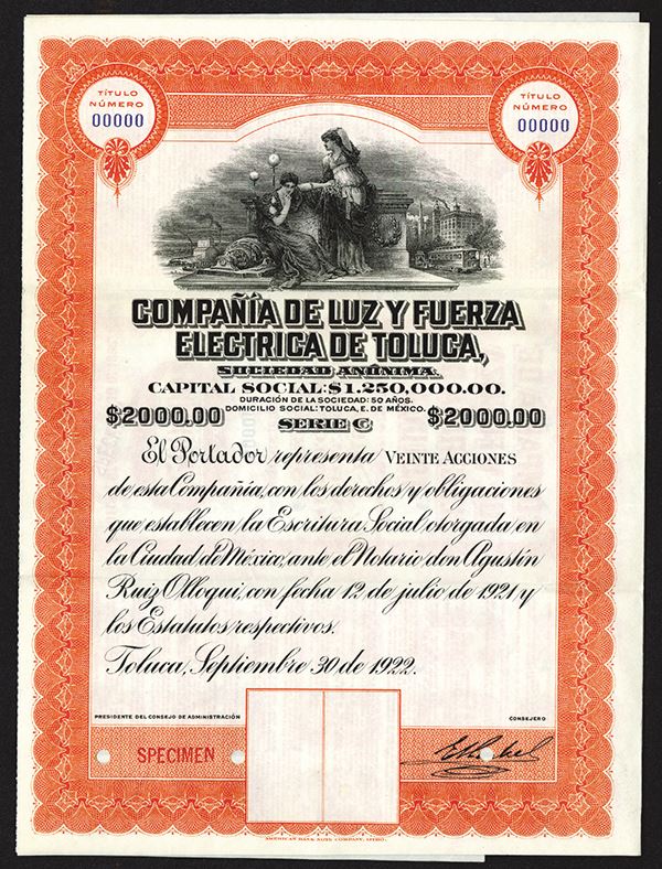 Toluca, Mexico. $1000 Specimen bond Series C, red frame, two women seated by wreathed monument and dynamo, ABNC, EF.