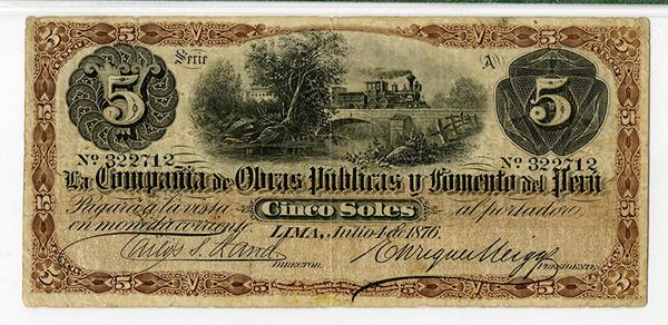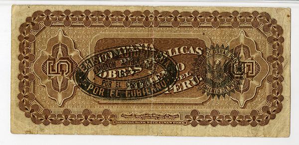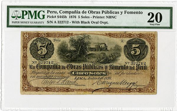 Peru, issued 5 Soles, P-S445b, with black oval overprint, PMG graded Very Fine 20 with comment "Splits, Pinholes". NBNC.