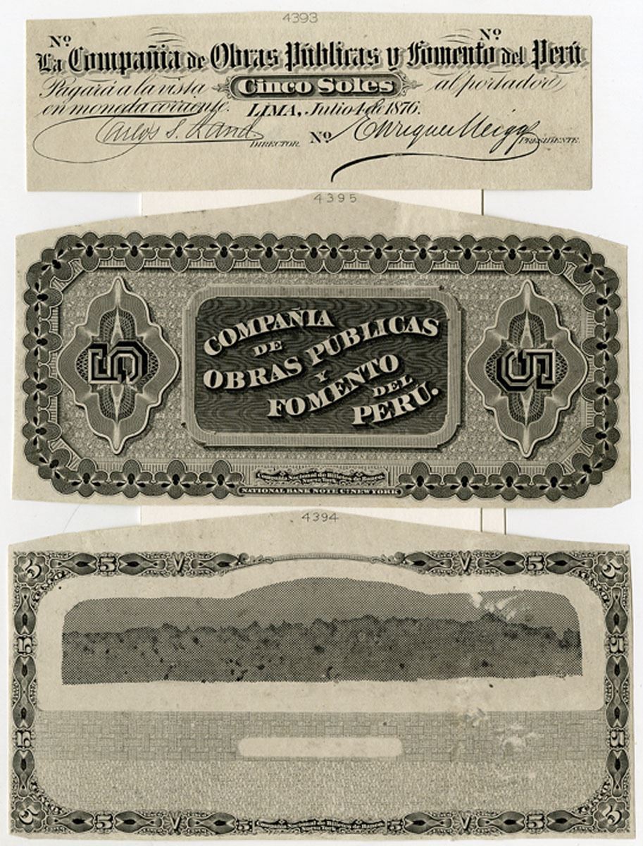 Peru, 1876. Lot of 3 progress proof design elements of 5 Soles, P-S445p banknote, intaglio printed on india paper in black, Includes: 5 Soles Face border and background with Plate # "4394" imprint at top; Back Proof of Compania de Obras Publicas y Fomento del Peru, 5 Soles with Plate # "4395" imprint at top; and Cinco Soles Face text with Plate # "4393" imprint at top. Uncirculated condition. CNBB/National BNC. (3)