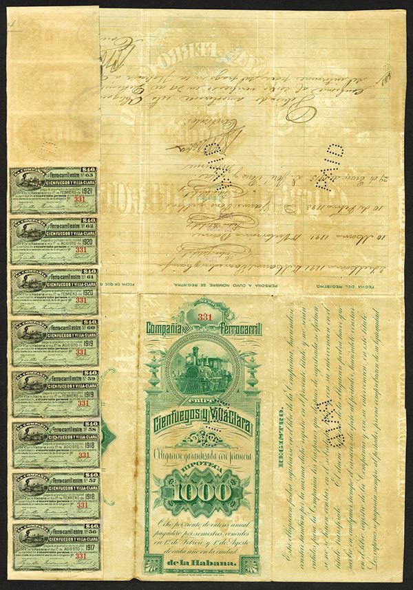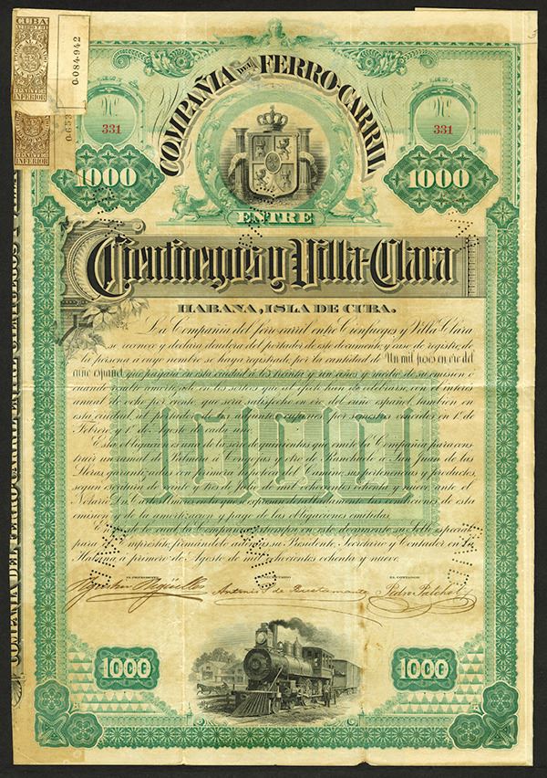 Havana, Cuba. $1000 Issued and Canceled 8% Bond. Certificate is written in Spanish with black print with an ornate green border and under print. Vignette of Cuba's coat of arms at top of certificate and a locomotive at the bottom. Pin punched cancels across bottom of bond. Some coupons still remain at back, two revenue stamps attached to top of certificate. Fine condition with minor toning and splitting along fold lines.
