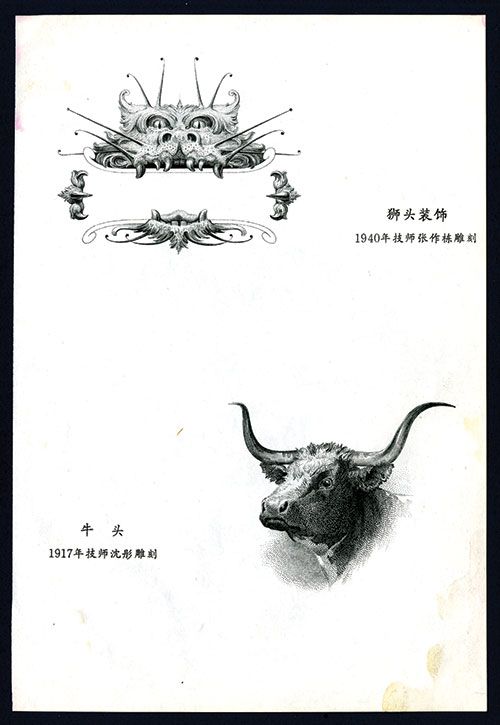 ND (ca. 1940-49), Printed in black on white paper, 5.3 x 7.8 inches, The dragon has text next to it dated 1940 and the steer has a date of 1917 with additional Chinese characters. Slight water stains on bottom right and toning on upper left, appears AU to Uncirculated.