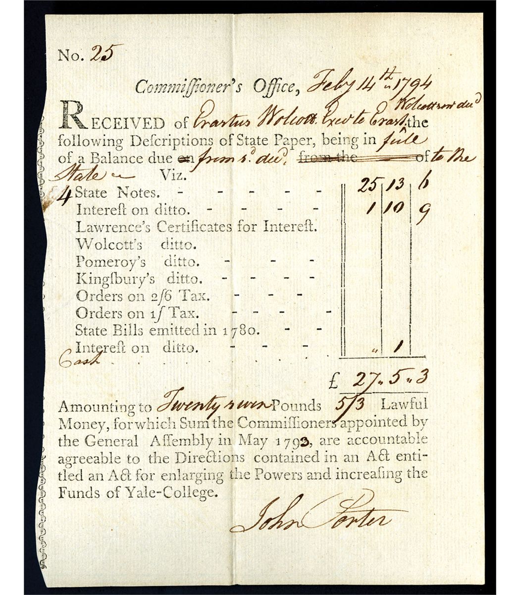 Feby 14th, 1794, No.25, to be paid Erastus Wolcott, as Executor. The note contains the following wording: "an Act for enlarging the Powers and increasing the Funds of Yale-College" then a divinity school. XF with one light vertical fold through middle.