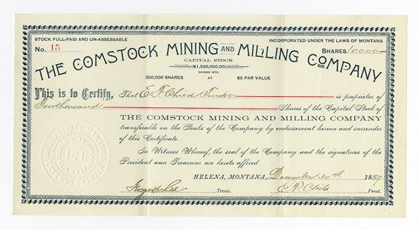 Montana. 10000 Shares Capitol Stock Issued and Uncanceled Stock Certificate. Blue print with a simple blue geometric border. Excellent condition.