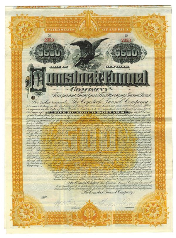 Nevada (Inc. in New York). $500 4% 1st Mortgage Income Coupon Bond, Black print on orange border and under tint, Bald Eagle at top above ornate company title, Fine-VF condition with damage to margins and splitting along fold lines, Homer Lee BNC. Theodore Sutro (born in 1845), a prominent lawyer of New York City, was instrumental in raising the capital for his brother's large venture. In 1887 he successfully defended the interests of the Sutro Tunnel Company, and organized its successor, the Comstock Tunnel Company. Theodore Sutro was active in the reform campaign of 1894 in New York, and was an authority on the law of taxation.
