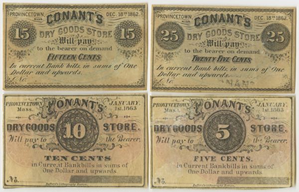 Provincetown, MA. Lot of 4 remainder notes from Conant's Dry Goods Store, includes 1863 issues, 5 cts; 10 cts; and 1862 issues, 15 cts; 25 cts, all are in XF to AU with some evidence of previous mounting. The 25 cts, 1862 note is a scarcer variety, Attractive set of scrip notes. (4)