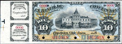18-- (ca.1880's). P-S179 Unlisted. 10 Peso Specimen. Red specimen overprint, POC and "00000" serial numbers. Choice AU to Unc. Counterfoil on left. ABNC.