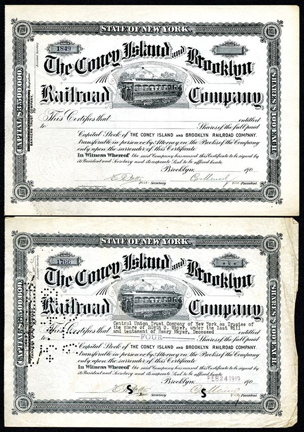 Coney Island & Brooklyn Railroad. Four Shares. 1919. NY. S/N 1766. Electric streetcar. VF+. Also included is an unissued example.