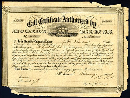 Richmond, Virginia, February 1, 1864, $10000, #3061, Ball 275, Type 147, Criswell 135, Issued bond, Vignette of sailing ship top center, Tyler signature, Fine condition with toning creasing and with left corner only one intact and splitting, Engd & Lithogd by Geo. Dunn & Comp.
