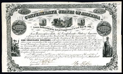Richmond, Virginia, July 1, 1861, $1000, #195, Ball 24, Type 16, Criswell 13, Issued bond, 15 Coupons attached, Men loading wagon top center flanked by ships with Native American prince on left and Minerva on the right, Tyler signature, VF condition with light toning and minor splitting on top edge, Engd. Hoyer & Ludwig Lithographed.