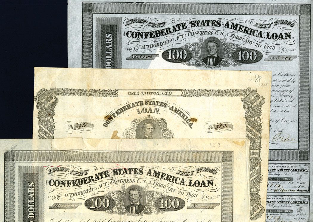 Confederate States of America. Lot of 3 bonds, Includes 2 examples $100.00 Bonds(Ball 166); $1,000.00 Bond, All in VG to VF condition.