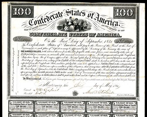 Lot of 2 New Orleans, 1861, $50 & $100, B-2; B-4 Issued bonds, Coupons attached, Tyler and Clitherall signatures, Fine condition lot, Douglas, Engr. N. Orleans.