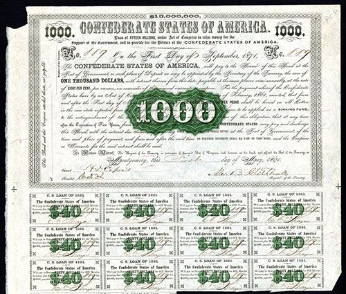 Lot of 5 bonds, all R-4+, Montgomery, Alabama, May 1, 1861, $1000, B-9 (Cr.8), #889, Green $1000 underprint, Clitherall signature, Fine condition with upper left corner missing. Columbia, South Carolina, Nov 26, 1862, $1000, B-110 (Cr.96), #'s 1112, 859, 857, VF condition with light toning and some creasing. Columbia, South Carolina, Jan 8, 1863, $1000, B-66 (Cr.86), #465, VF condition with light toning and some creasing.