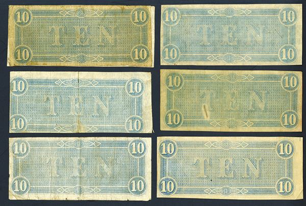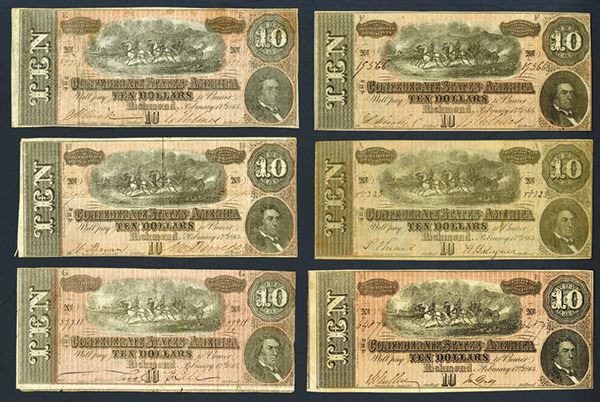 CSA. Battlefield scene with four horses pulling cannon at top center. R.M.T. Hunter at lower right. Fr CS-68. Generally Very Good or so. Some cut tight. 6 pieces.