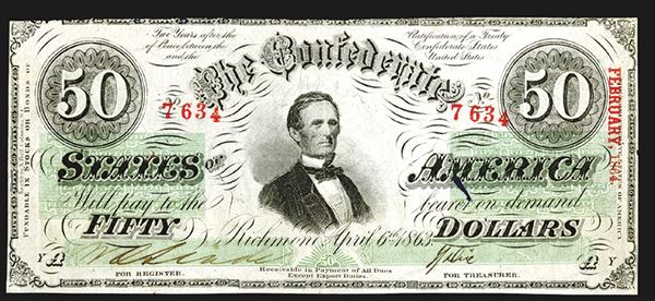 T-57. Jefferson Davis at center. Extremely Fine, cut cancelled (fragment missing), graffiti at top of portrait.