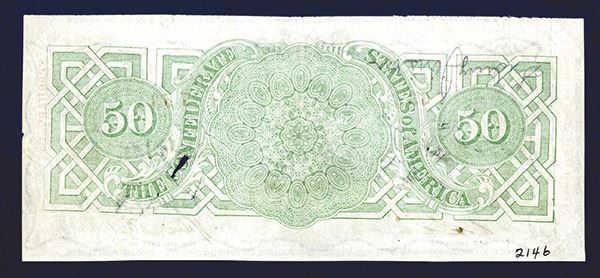 T-57. Jefferson Davis at center. Extremely Fine, cut cancelled (fragment missing), graffiti at top of portrait.