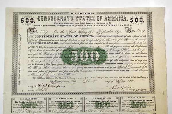 Denomination in ornate green scroll at center, 14 coupons. Sinking Fund for the Confederate Loan printed in blue on back. VF+.