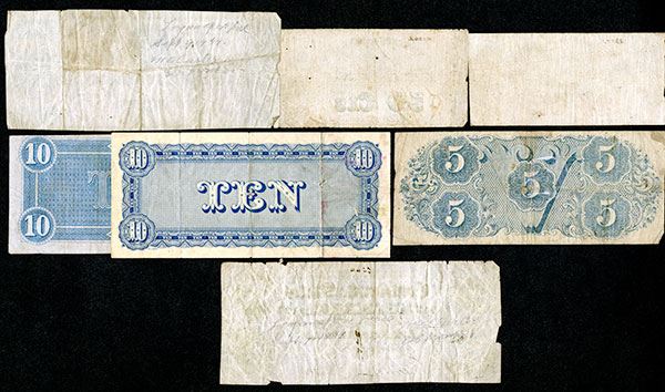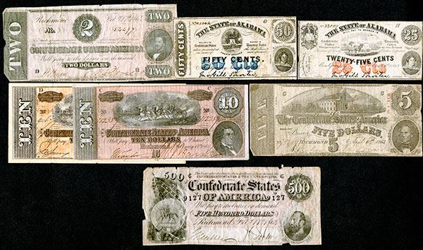 Confederate States. $5. 1863, CS-60; $500. 1864 CS-64; $10. 1864 CS-68; $2. 1864 CS-70; Plus Alabama State 25c and 50c notes of 1863 and a facsimile CSA $10. Generally Good with rough edges. 7 pieces.