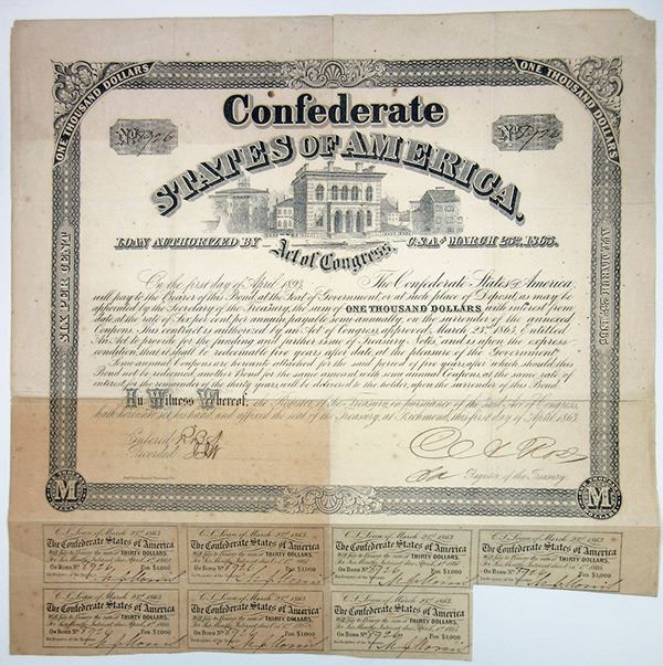 Richmond, VA. April 1, 1863, $1000, Old Customs House, signed by Rose, 7 coupons. VF details, one panel age toned.