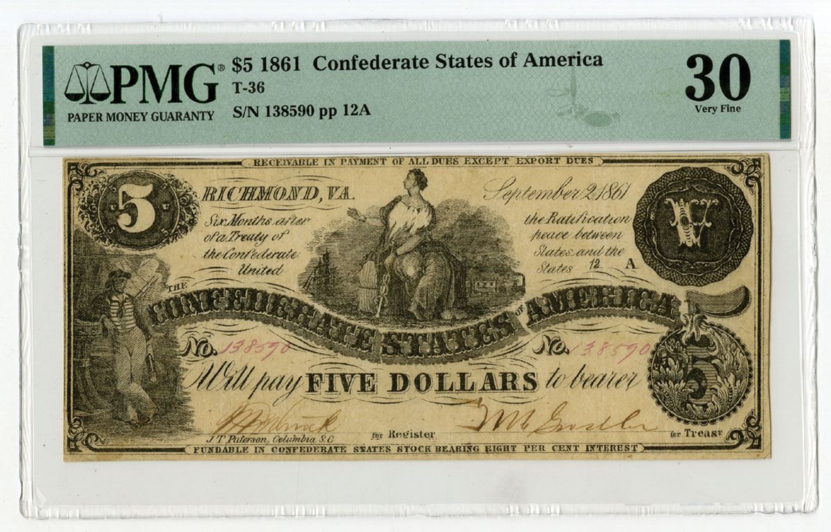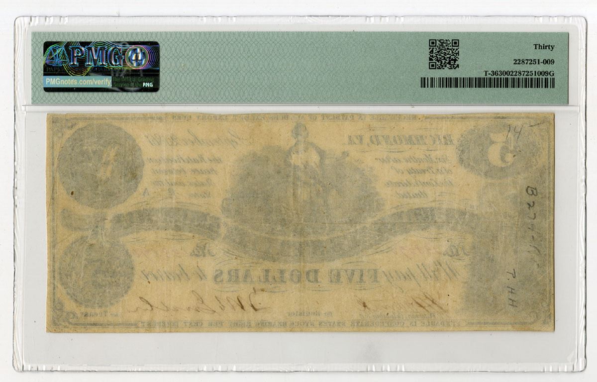 Richmond, Virginia, 1861. $5, T-36, I/U Banknote, Black print with woman at center and sailor at left side, S/N 138590 pp 12A, PMG graded Very Fine 30.