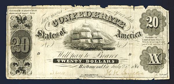Richmond, VA. July 25th, 1861, $20, T-8, pp D. Sailing Ship, blank back, Good condition with splitting at folds, small tears and chips out of the margin, still a collectible example for the beginning collector. Sold "As Is". Hoyer & Ludwig.