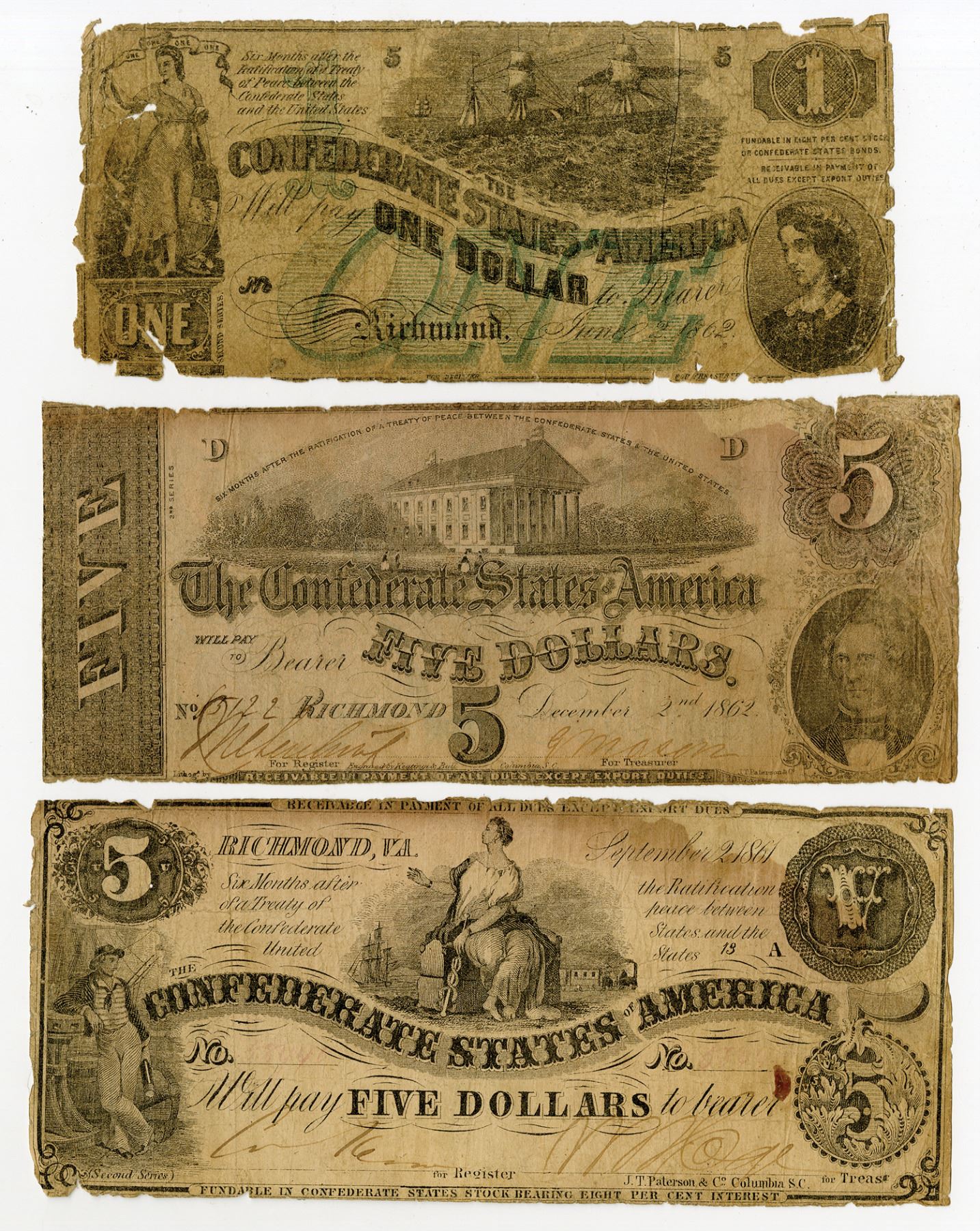 Richmond, Virginia. Confederate States of America, Lot of 3 notes, Includes, 1861-62 $5, T36, Cr.276; $5, T53, Cr.383; and, $1, T44, Cr.340. Condition varies between VG with minor tears, small pieces missing from edges and pin holes to VG condition. (3)