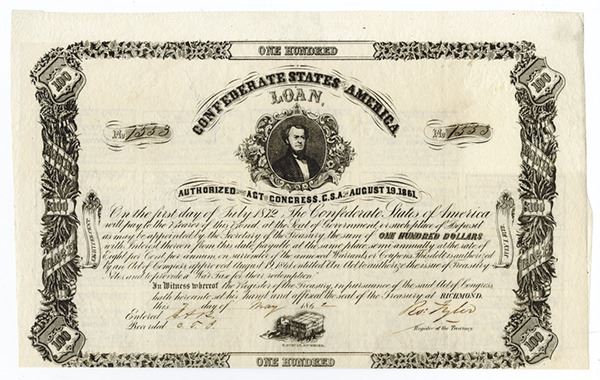 Richmond, Virginia and Holland. $100 I/U, S/N 1553, Counterfeit bond printed about 1879 in Europe. A small white tell-tale dot to the left of Mallory's portrait identifies this as a counterfeit. VF condition with all but 1 coupon attached. Scarce.