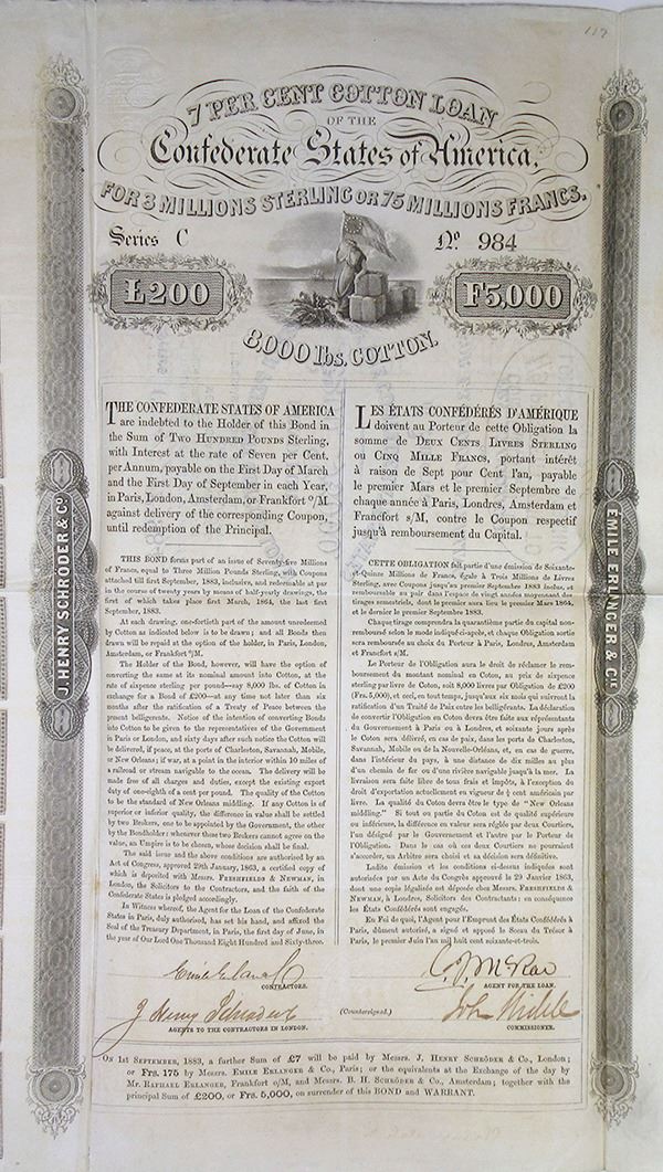 Confederate States, 1863, 200 Pounds Sterling or 5,000 Francs, Series C, 7% Cotton Loan, I/U Bond, S/N 984, Black ornate border, Allegorical woman top center by cotton bales holding a Confederate flag while the sun rises (or sets) over the ocean, Missing the left had rows top 4 coupons otherwise it is complete, VF to Choice VF condition. Scarce, attractive and popular Confederate issue.