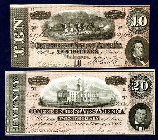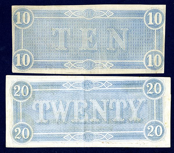 Richmond, VA. Feb. 17th, 1864, Lot of 2 notes, Includes $10, Series 5, T-68, Choice XF to AU, cut close on bottom, pp D 55; and, $20, Series 4, T-67, pp C. Attractive pair of crisp notes.