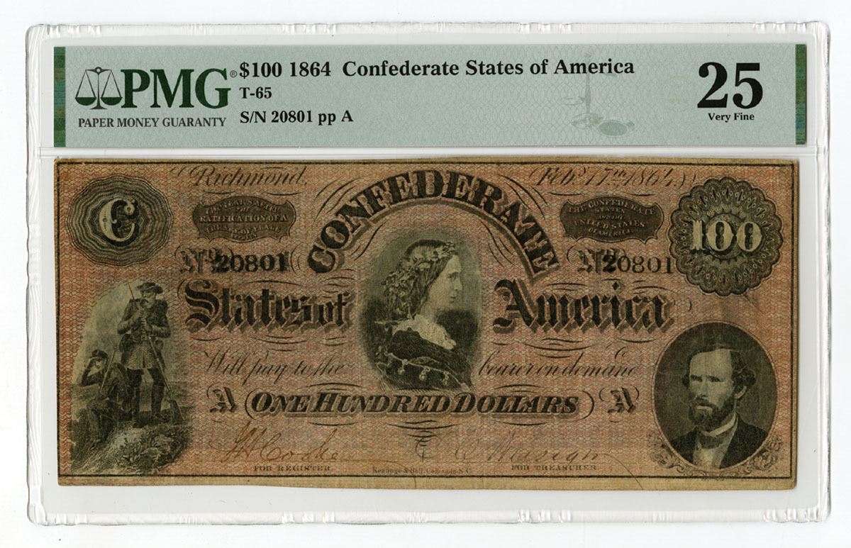 Confederate States of America, 1864. $100, P-71 SL#72 T-65, Issued Banknote, Black with red underprint, Portrait of Lucy Pickens at top center with two soldiers at bottom left and George W. Randolph at lower right, S/N 20801 pp A, PMG graded Very Fine 25 with comment "Annotation," K&B.