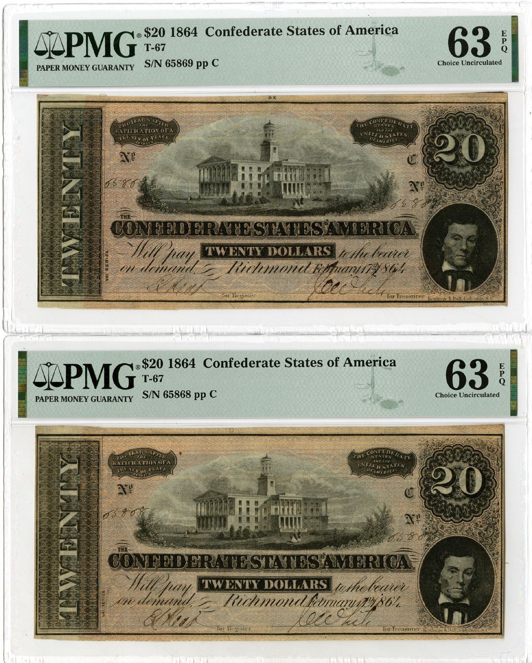 Virginia, 1864. $20, T-67, P-69, SL#70, Sequential Pair of Issued Banknotes. Red underprint. Capital at Nashville Tenn. at top center with portrait of A. H. Stephens at right. S/Ns 65868 pp C & 65869 pp C Printer: K&B. Both notes are PMG graded Choice Uncirculated 63 EPQ. (2)