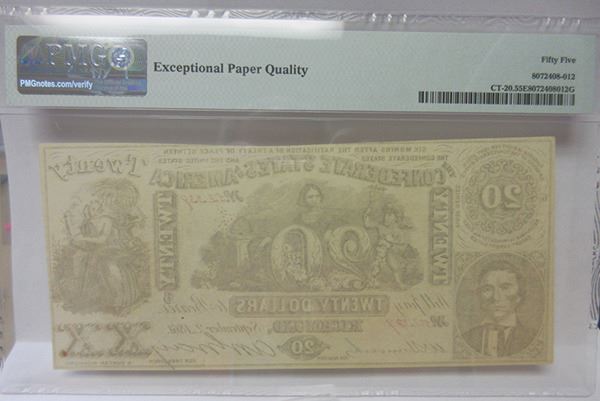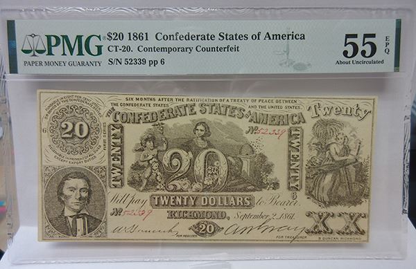 Richmond, VA. 1861, $20, CT-20 Contemporary Counterfeit, Black printing with no underprint, S/N 52339 pp 6, PMG graded About Uncirculated 55 EPQ. Attractive note for grade. B. Duncan, Richmond..
