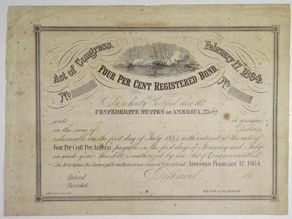 Richmond, Virginia, 1864. $-Odd, U/U, 4% Registered Act of Congress February 17, 1864 Confederate Bond, Black text with black border, Naval Battle scene with Merrimack type of iron clad ship sinking Union sailing ships depicted at top center. Fine condition with foxing throughout bond. Confederate war finance involved the various means, fiscal and monetary, through which the Confederate States of America financed its war effort during the American Civil War of 1861-1865. As the war lasted for nearly the entire existence of the Confederacy, military considerations dominated national finance.