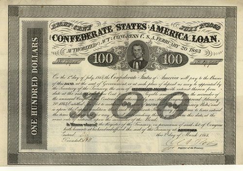 Lot of 5 bonds. 1). South Carolina, $100, 5% Bond, #19918, Coupons attached, Vice President Stephens, Fine condition, Evans & Cogswell. Ball #166. 2). Virginia, 1865, $1000, 6% Partially Issued Bond, #18178, VF condition, Geo. Dunn & Co. Ball #366. 3). Virginia, 1864, $100, 6% Issued and Uncancelled Bond, #6292, Fine condition with small piece missing bottom margin and some creases and stains, Geo. Dunn & Co. Ball #362. 4). Richmond, Virginia, 1863, $1000, 6% Bond, #8926, Coupons attached, Vignette of old U.S. customs house, Fine condition and upper right corner missing, Dunn & Co. Ball #266. 5). Richmond, Virginia, 1863, $100, 6% Bond, #1020, Coupons attached, Vignette of old U.S. customs house, Fine condition with blue ink stain bottom right corner, Dunn & Co. Signed by Tyler Rose, earlier issues were signed by Jones. Ball #259.