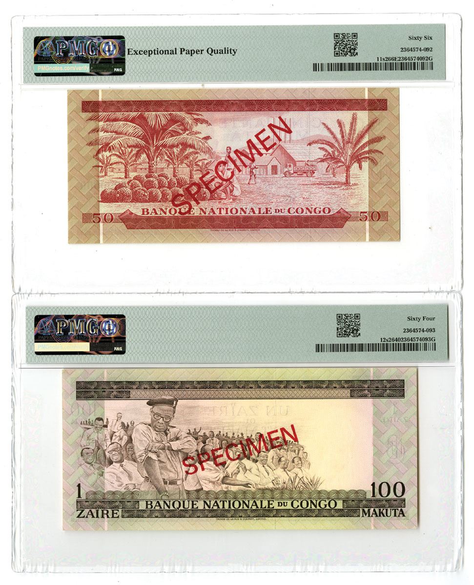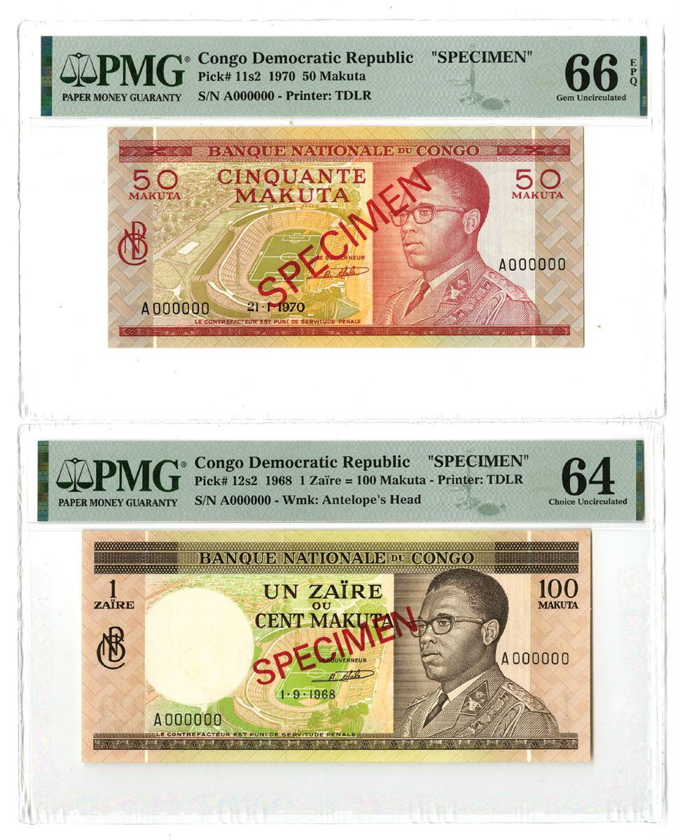 Congo Democratic Republic, 1968 to 1970. Lot of 2 Specimen Banknotes, Includes: 1970, 50 Makuta, P-11s2, S/N A000000, PMG graded Gem Unc 66 EPQ; 1968, 1 Zaire = 100 Makuta, P-12s2, S/N A000000, PMG graded Choice Unc 64. Both notes have Specimen overprints, POCs, and printed by TDLR. (2). Sold "AS IS" no returns accepted.