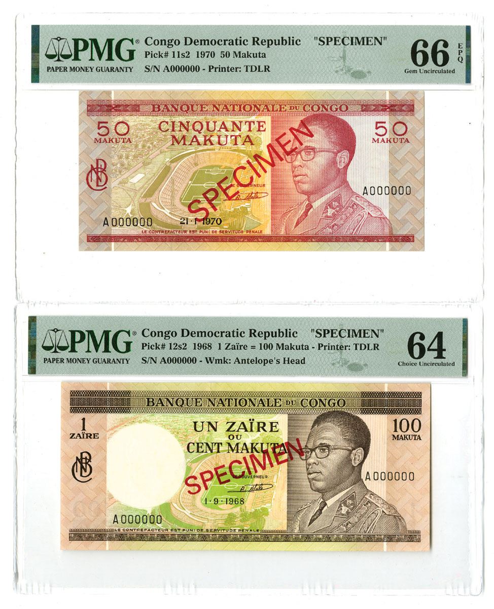 Congo Democratic Republic, 1968 to 1970. Lot of 2 Specimen Banknotes, Includes: 1970, 50 Makuta, P-11s2, S/N A000000, PMG graded Gem Unc 66 EPQ; 1968, 1 Zaire = 100 Makuta, P-12s2, S/N A000000, PMG graded Choice Unc 64. Both notes have Specimen overprints, POCs, and printed by TDLR. (2). Sold "AS IS" no returns accepted.