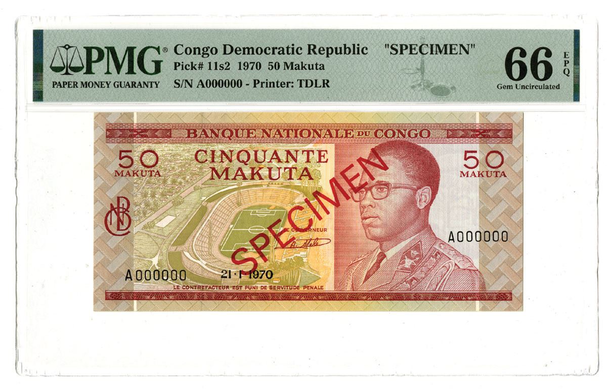 Congo Democratic Republic, 1970. 50 Makuta, P-11s2, Specimen Banknote, Red on olive-green and m/c underprint with stadium at center and Mobutu at right, Back is red and m/c trees and fruit harvest at center, Specimen overprints, S/N A000000, PMG graded Gem Uncirculated 66 EPQ, TDLR.