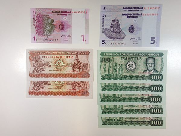 Lot of 10 notes, includes Congo P-80a, P-81a(2), Mozambique P-126(5), P-129, P-129b, all Uncirculated. (10)