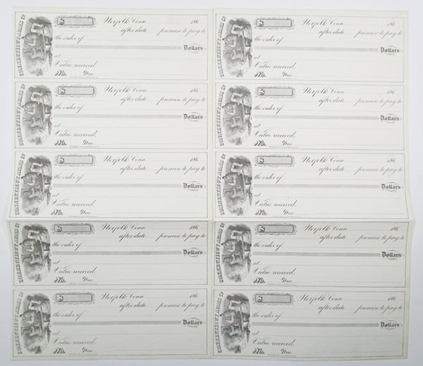 Connecticut, 1860s. Lot includes 2 pieces (10 Checks), both uncut sheets of 5 checks for the Connecticut Arms Company. Black text with black border, Allegorical men at work in forge at left. VF condition. The Connecticut Arms Company was located in Norfolk, CT, and manufactured firearms for the Union during the American Civil War. By the warÕs end, Connecticut makers had supplied some 43% of the grand total of all rifle muskets, breech loading rifles and carbines (a lighter rifle with a shorter barrel), and revolvers bought by the War Department, along with staggering quantities of small arms and artillery ammunition. (2 Sheets of 5 Checks each for a total of 10 Checks).
