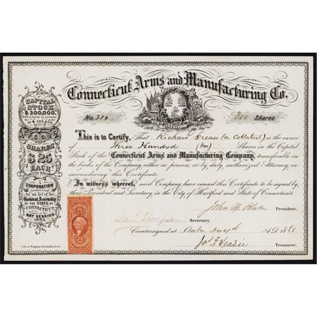 Hartford, CT, 1868. 300 Shares, Issued and uncancelled stock certificate, Black with ornate title with Connecticut Arms in middle and detailed and ornate counterfoil on left with $300,000 Capital Stock listed. 25cts U.S. adhesive Certificate 1st Issue revenue stamp on lower left, Cert.# 210, VF condition. They manufactured the “Bulldog “ derringer pistol. Rare and early gun manufacturer.