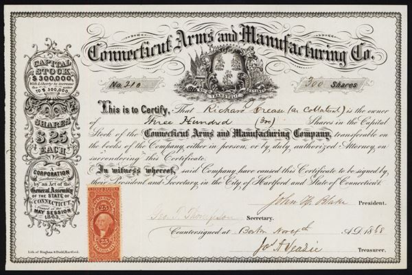 Hartford, CT, 1868. 300 Shares, Issued and uncancelled stock certificate, Black with ornate title with Connecticut Arms in middle and detailed and ornate counterfoil on left with $300,000 Capital Stock listed. 25cts U.S. adhesive Certificate 1st Issue revenue stamp on lower left, Cert.# 210, VF condition. They manufactured the "Bulldog" derringer pistol. Rare and early gun manufacturer.